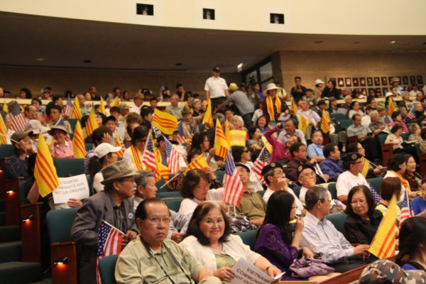 LITTLE SAIGON - Bất chấp sức nóng trên 90 độ vào trưa Thứ Ba ngày 8 tháng Tư, 2014, và mặc dù đã biết Nghị viên Agran rút lại đề nghị kết nghĩa với thành phố Irvine nhưng đồng hương Việt Nam vẫn lũ lượt kéo tới bãi đậu xe trước Hội Đền Hùng Hải Ngoại (góc Magnolia – Harzard) để làm lễ xuất phát, và được biết tại một địa điểm khác, Cộng Đồng Việt Nam Nam Cali do cựu Đại tá Lê Khắc Lý làm Chủ Tịch LT cũng có xe đưa đồng hương đến Tòa Thị Chính Irvine tham dự buổi điều trần và biểu tình, để chứng tỏ cho Nghị viên Larry và các Nghị viên khác cũng như những thành phố lân cận biết quyết tâm của cộng đồng tỵ nạn Việt Nam, không chấp nhận giao lưu với bất cứ thành phố nào của Việt Nam, khi chế độ Cộng sản còn cai trị đất nước.