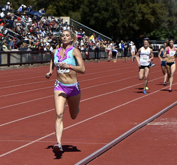 Cũng tại giải đấu Sacramento ở bán kết cự ly 800m, Vessey trông không khác gì người mẫu với bộ đồ hai màu đen trắng, khoét một bên hông, lệch vai gắn nơ. 'Tôi biết cuộc thi sẽ diễn ra vào buổi tối nên tôi muốn làm gì đó thể hiện sự trân trọng', người đẹp thổ lộ.