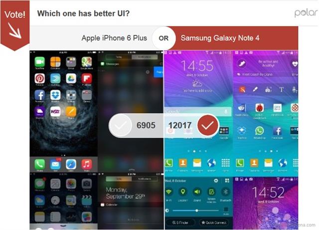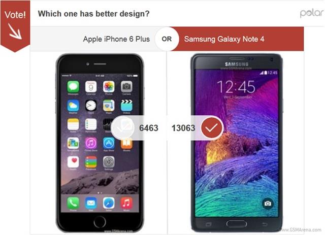 Đầu tiên là so sánh thiết kế, Galaxy Note 4 đã đạt tỷ lệ phiếu 67% trong gần 20.000 người bỏ phiếu bình chọn, tỷ lên với iPhone 6 Plus là 2:1.