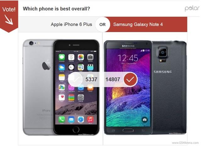 Cuối cùng đó là đánh giá chung về tổng thể. Samsung Galaxy Note 4 vẫn tiếp tục ‘đè bẹp’ iPhone 6 Plus với tỷ lệ phiếu 74%. Một chiến thắng thuyết phục.