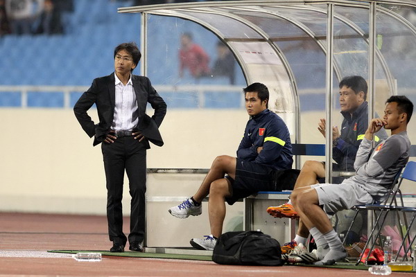 HLV Toshiya Miura (đứng) đă nói rơ với các tuyển thủ Việt Nam về một thứ bóng đá đơn giản, ít chạm
