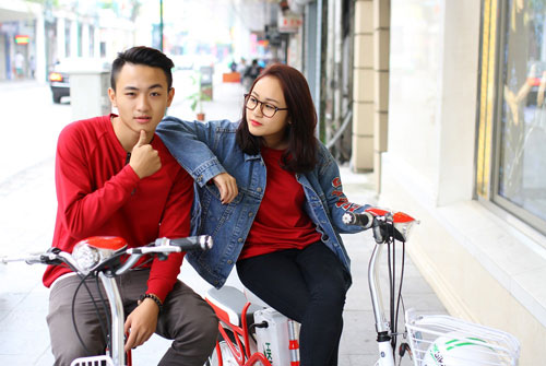 Đỏ từ khăn đến chân váy, đến cả chiếc xe đạp điện như thế này,... Hà Nội đã đủ ấm chưa?