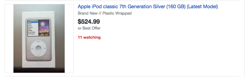 Nó trông giống như một vài người vẫn dành nhiều tình cảm đó và sẵn sàng trả rất nhiều để có thể sở hữu thiết bị cổ điển này. iPod Classics đang được bán trực tuyến với giá hàng trăm đô la - thậm chí kể cả khi chúng bị hư hỏng! Khi tôi nhìn qua danh sách eBay, mức giá cao nhất là tôi tìm thấy là 524 $ cho một chiếc iPod Classic mới vẫn còn trong hộp. Dưới đây là ảnh thực tế: