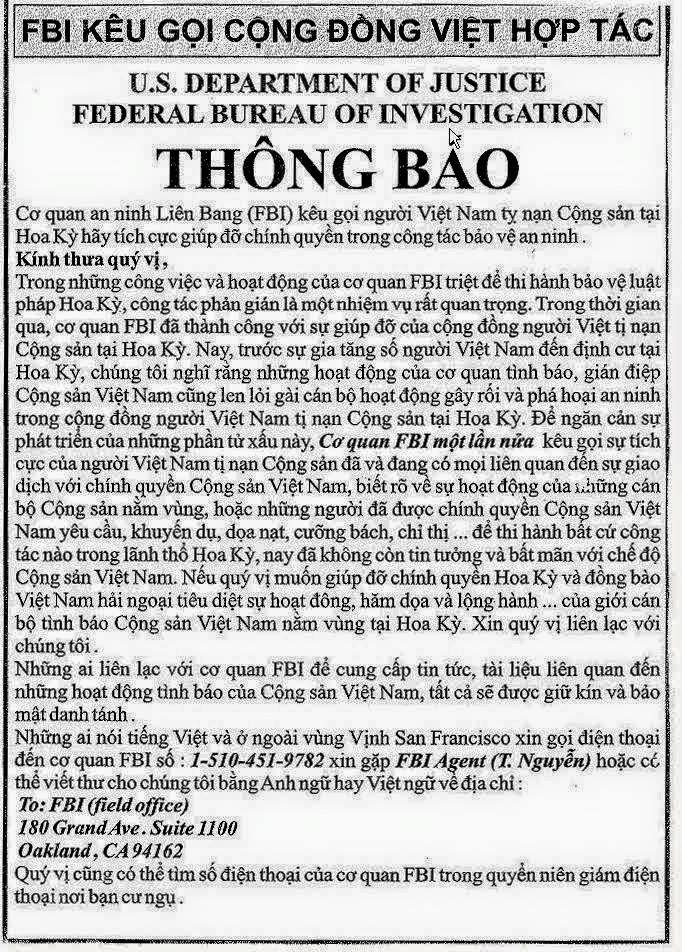 FBI kêu gọi cộng đồng người Việt hợp tác.