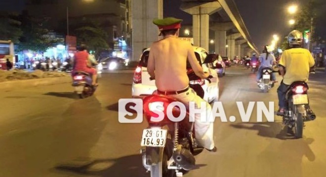 Vào lúc 21h30 phút ngày 7/5, trên đường Nguyễn Trãi (Thanh Xuân, Hà Nội), một người đàn ông tầm trung tuổi, đi chiếc xe máy mang BKS: 29G1: 164.93, đội mũ cảnh sát nhưng lại cởi trần.Độc giả ghi lại hình ảnh này chia sẻ, người đàn ông vi phạm giao thông rất nghênh ngang đi dọc trên đường Nguyễn Trãi, nhưng không gặp bất kỳ sự cản trở nào.