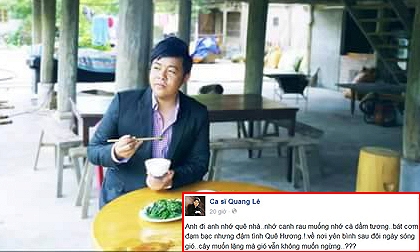 Ngay khi scandal đang giai đoạn đỉnh điểm cùng đàn anh thì Quang Lê tức tốc về Mỹ. Mới đây, nam ca sỹ chia sẻ đầy tâm trạng: “Anh đi anh nhớ quê nhà, nhớ canh rau muống nhớ cà dầm tương, bát cơm đạm bạc, nhưng đậm tình quê hương. Về nơi yên bình sau đôi ngày sóng gió, cây muốn lặng mà gió vẫn không muốn ngừng”.