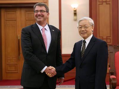 Bộ trưởng Bộ Quốc phòng Hoa Kỳ Ash Carter bắt tay với ông Nguyễn Phú Trọng trong một cuộc gặp mặt diễn ra vào tháng Sáu vừa qua ở Hà Nội. photo courtesy: Luong Thai Linh/EPA/Landov