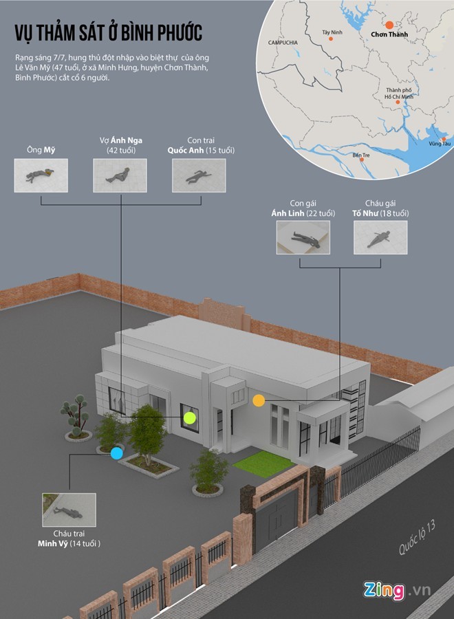 Khoảng 2h ngày 7/7, hai nghi phạm đi xe máy từ TP HCM đến cổng nhà nhà đại gia gỗ. Dương nhắn tin cho Vỹ ra mở cổng. Dắt xe vào vào, Dương và Tiến liền khống chế Vỹ, sát hại nạn nhân ngay trong sân biệt thự.