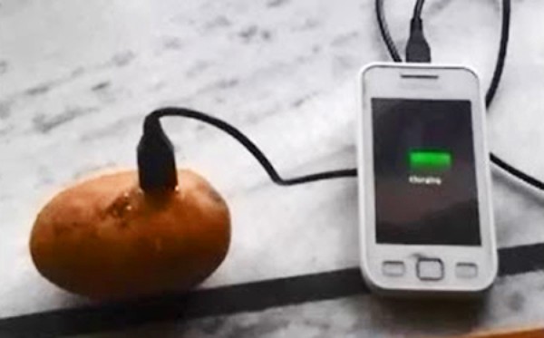 Điều khó tin nhưng là sự thật 100%. Bạn chỉ việc cắm trực tiếp dây sạc vào củ khoai tây là có thể giúp chiếc điện thoại được sạc pin như cắm điện.