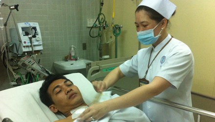 Bệnh nhân Đào Thiện Thắng sau ca phẫu thuật lấy mũi tên điện ra khỏi ngực tại Bệnh viện Chợ Rẫy TPHCM. Ảnh: Quốc Ngọc