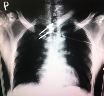 Bác sĩ Hiệp cho biết, dị vật cắm sâu vào thành ngực ở vũng hõm ức lệch phải. “Lần đầu tiên tôi mới thấy dị vật này. Qua phim X-quang, phần ngập trong ngực bệnh nhân có hình như mũi tên với 2 mũi kim loại nhọn dài khoảng 3cm, có thể được tự chế từ căm xe. Phần kim loại này được gắn vào cán gỗ dài. Một trong 2 mũi nhọn còn ”, ông nói.