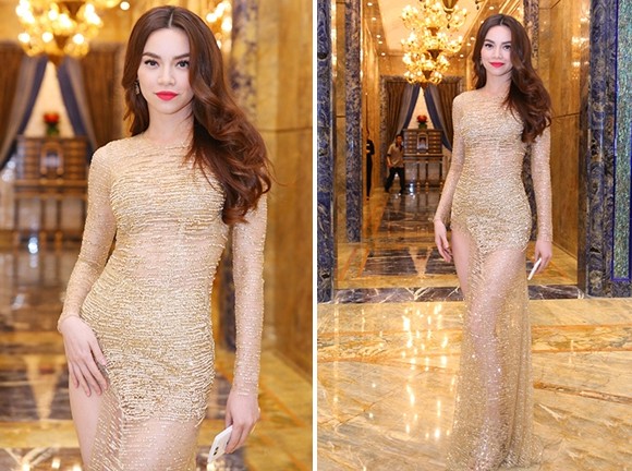 Chiếc váy Hồ Ngọc Hà diện trong một sự kiện gần đây nằm trong top những bộ váy xuyên thấu gợi cảm. Thiết kế vải mỏng kết hợp với dải ánh kim tôn hình thể cân đối, kiêu sa của người mặc. Hồ Ngọc Hà cũng khéo léo chọn tông trang điểm, tóc xoăn quyến rũ và hạn chế phụ kiện để tạo hình ảnh sang trọng. Ảnh: Bil