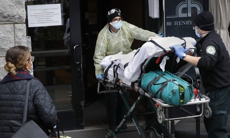 Nhân viên y tế di chuyển một bệnh nhân nghi nhiễm nCoV ở Brooklyn, New York, ngày 17/4. Ảnh: AP.