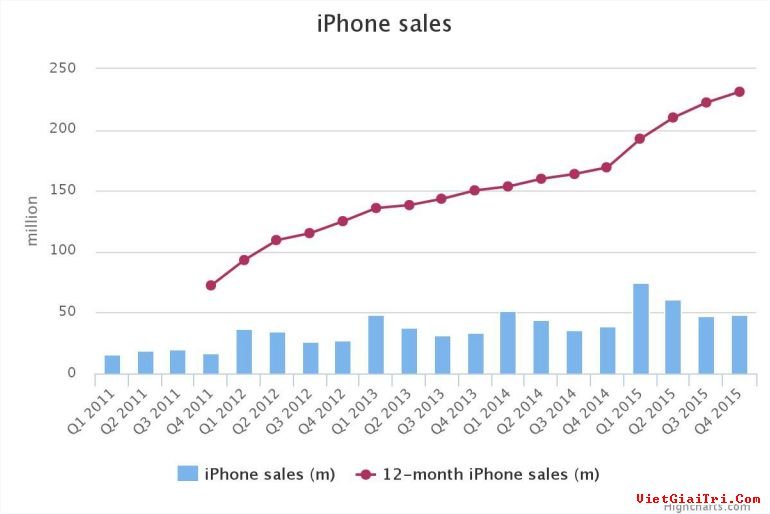 Giám đốc điều hành Tim Cook cũng cho biết, quý vừa qua tiếp tục đánh dấu sự tăng trưởng của iPhone, với mức tăng doanh thu vào khoảng 22%, công ty bán được 48 triệu máy bao gồm cả bộ đôi 6S.