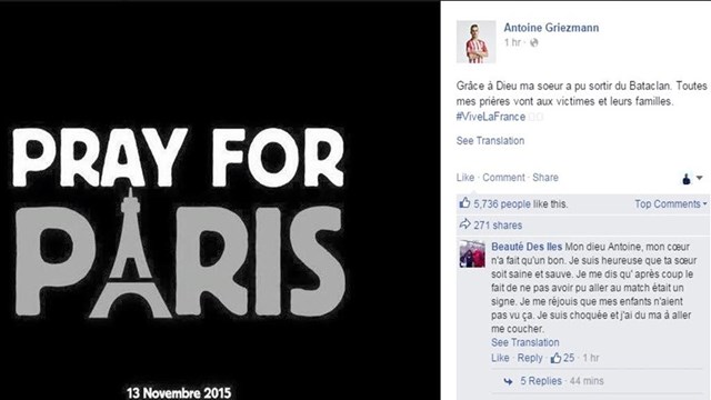 Tuy nhiên ngay sau đó, tiền đạo Antoine Griezmann là người đầu tiên đăng lên các trang mạng xã hội chia sẻ về vụ khủng bố này, trong đó đặc biệt cho biết em gái của anh đã có mặt tại nhà hát Bataclan.