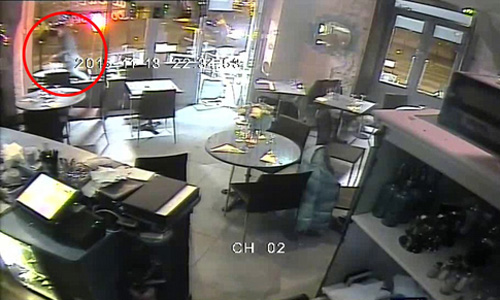 Tay súng cầm khẩu AK, đến gần cửa ra vào. Bên trong, một khách hàng đang nấp cạnh bức tường, khuất tầm nhìn của kẻ khủng bố. Tuy nhiên, tên này không vào quán, mà hắn đi sang bên phải, nơi hai phụ nữ đang trốn dưới gầm bàn trên vỉa hè.
