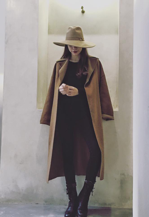 Hồ Ngọc Hà thể hiện nét cá tính và phóng khoáng với cách kết hợp áo choàng dài cắt may trên chất liệu vải dạ, mũ rộng vành vải nỉ và bốt da cao cổ.