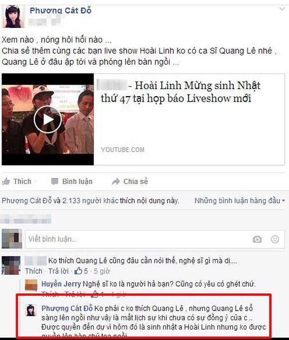 Sau buổi giới thiệu liveshow của nghệ sĩ Hoài Linh, Cát Phượng đã tỏ ra không hài lòng với cách ứng xử của Quang Lê. Nghệ sĩ Cát Phượng viết: "Xem nào, nóng hôi hổi nào. Chia sẻ thêm cùng các bạn liveshow Hoài Linh không có ca sĩ Quang Lê nhé. Quang Lê ở đâu ập tới và phóng lên bàn ngồi".