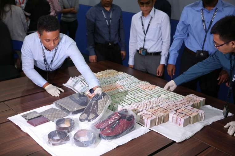 Số tiền và hiện vật cảnh sát thu hồi được từ khách sạn mà các nghi phạm thuê. Ảnh: CNA