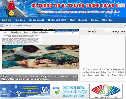 Sáng nay 12/1, trang web của Sở Thông tin – Truyền thông Quảng Nam đã đăng tải thông tin về quyết định xử phạt hành chính của Thanh tra Sở liên quan đến bài viết “Quảng Nam dân chài lưới bắt được nàng tiên cá” trên trang thông tin điện tử quangnamonline.com.v n.