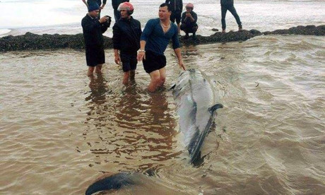 Một con cá voi dài hơn 5m nặng khoảng 3 tấn đã trôi dạt vào bãi biển thuộc khu vực xã Bạch Long, huyện Giao Thủy, tỉnh Nam Định đã được người dân cùng công an xã đưa ra biển an toàn.