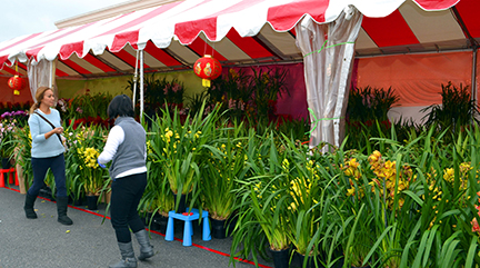 Rời gian hàng của anh Khanh, chúng tôi ghé vào gian hàng bán hoa lan thật. Gian hàng có hai phụ nữ đang sắp các chậu lan cho ngay hàng thẳng lối. Có lẽ đây là gian hàng nhiều lan nhất trong Chợ Hoa, đa số là lan đất và đặc biệt chậu nào cũng xanh tươi, hoa chưa nở bung, còn rất nhiều nụ và theo chị bán hàng, các chậu hoa này sẽ nở đúng vào ngày Tết và sẽ còn chơi được một vài tuần sau Tết. Giá tiền thì căn cứ vào số nhánh bông, cứ mỗi nhánh thêm $5. Thí dụ chậu năm nhánh bông bán $25 thì chậu sáu nhánh bông bán $30, đại để là như vậy. Đây là gian hàng của Bà Tư Bán Trái Cây Tươi nổi tiếng ở cùng dãy với chợ ABC.