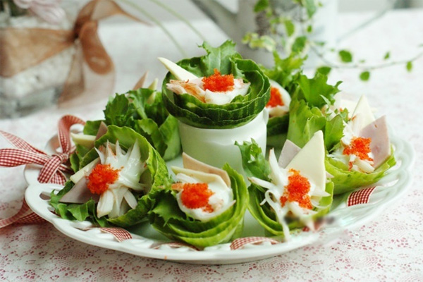 Bạn cuộn bông hoa dưa leo đặt trong chiếc cốc nhỏ. Đặt lá diếp xoắn, pho mát, thịt ham, thịt cua vào trong bông hoa. Tiếp đến, cho ít sữa chua lên, trên cùng là trứng cá hồi.