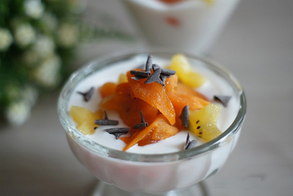 Cuối cùng rắc thêm vụn chocolate lên trên mặt là xong. Cốc sữa chua của bạn hấp dẫn hơn khi ăn kèm với kiwi, hồng đấy. Sữa chua thích hợp dùng làm món ăn tráng miệng vừa ngon, bổ dưỡng lại có tác dụng kích thích tiêu hóa, nhuận tràng, phòng táo bón, đặc biệt giúp hấp thu chất sắt có trong thực phẩm.