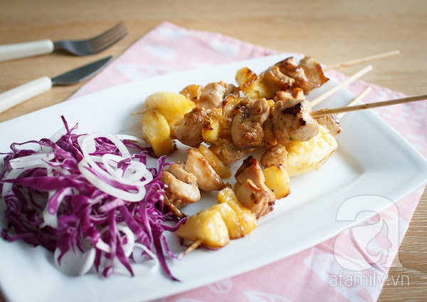 Xiên gà và dứa xen kẽ vào que (đã ngâm nước).