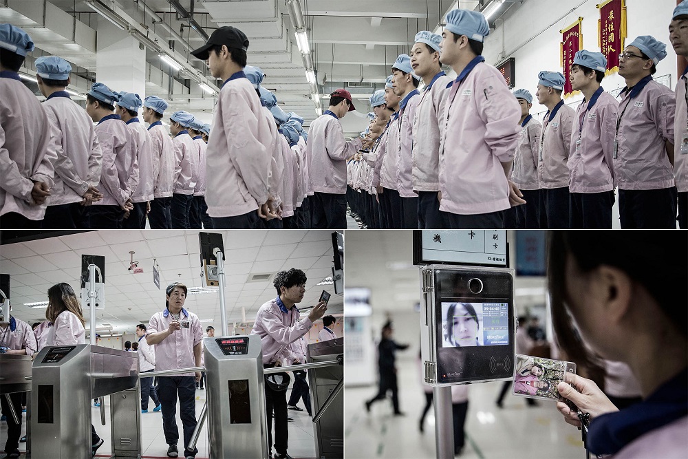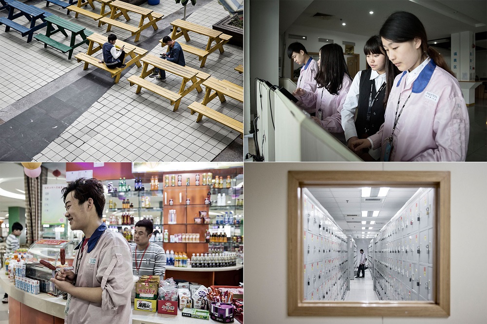 Khi đi qua một máy dò kim loại dùng để phát hiện camera, thiết bị có thể được dùng để rò rỉ hình ảnh sản phẩm mới chưa phát hành, người lao động đi theo chiều mũi tên ở trên sàn và các tấm áp phích đẹp trên tường. Họ leo lên cầu thang có tấm lưới an toàn quấn quanh nhằm ngăn chặn tai nạn hoặc tự tử. Tại hàng tủ cá nhân, họ cất giày dép của mình và thay bằng dép nhựa sạch.