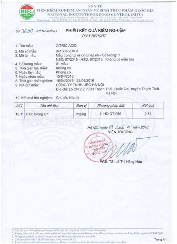 Kết quả xét nghiệm cho thấy hàm lượng chì trong Acid Citric nguyên liệu của công ty URC Việt Nam vượt mức cho phép rất cao. (Hình: VNExpress)