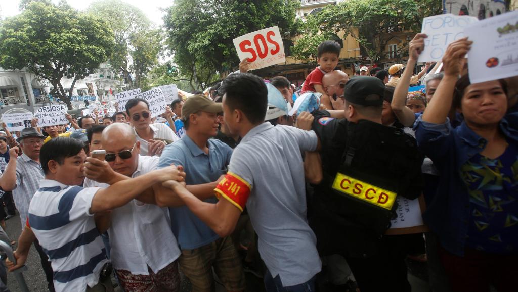 Công an cản trở người dân biểu tình phản đối vụ cá biển ở miền Trung chết hàng loạt do nghi bị ô nhiễm.