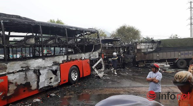 Tai nạn xảy ra vào lúc 4 giờ sáng nay trên Quốc lộ 1A đoạn qua thị trấn Thuận Nam, huyện Hàm Thuận Nam, cách thành phố Phan Thiết 26 ki-lô-mét. Tại hiện trường, 2 xe khách gường nằm và 1 chiếc xe tải bị cháy rụi nằm ngang đường. Quốc lộ 1 ở đoạn này bị tê liệt trong nhiều giờ mới được giải tỏa.