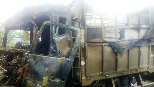 Chiếc xe tải cũng bị cháy phần đầu do ngọn lửa leo sang (Ảnh: H.Thịnh)