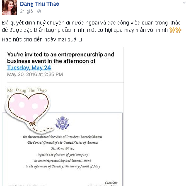 Hoa hậu Thu Thảo cho biết đã nhận được lời mời của Lãnh sự quán Mỹ tại TP HCM tới tham dự bữa tiệc riêng tư với sự có mặt đặc biệt của Tổng thống Mỹ cùng rất nhiều đại diện của các doanh nghiệp trẻ trên địa bàn cả nước.
