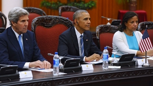Từ trái qua: Ngoại trưởng John Kerry, Tổng thống Barack Obam và Cố vấn An ninh Susan Rice tại cuộc họp song phương với các lãnh đạo Việt Nam ngày 23/5. Ảnh: EPA