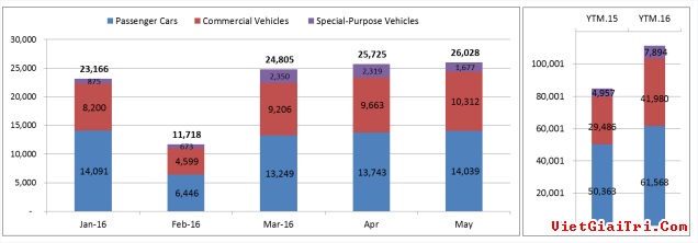 Trong tháng 5/2016, doanh số bán hàng của toàn thị trường ô tô đạt 26.028 xe, tăng 1% so với tháng 4/2016 và tăng 45% so với cùng kỳ năm trước.