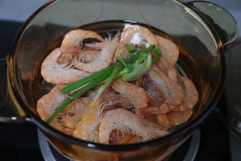 Chuẩn bị tôm: Rửa sạch tôm dưới nước lạnh. Nếu không sử dụng phần đầu, có thể loại bỏ đầu tôm.