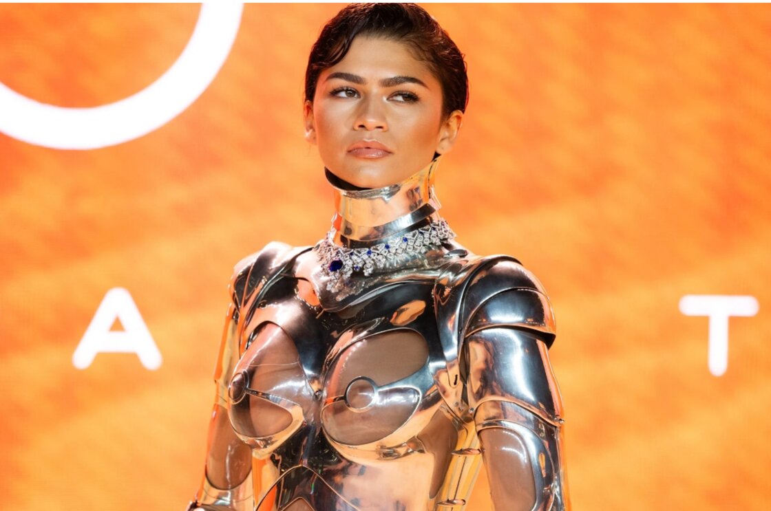 Zendaya tại buổi ra mắt Dune 2 ở London, (Anh): Zendaya với bộ áo giáp vintage bằng kim loại sáng bóng, để lộ vòng 3, đã trở thành tâm điểm trên các diễn đàn thời trang suốt thời gian dài. Trang phục "robot" này là phép ẩn dụ nghệ thuật về nữ quyền và mối quan hệ phức tạp giữa phụ nữ và máy móc. Glamour bình chọn đây là diện mạo thời trang đẹp nhất năm 2024. Ảnh: Polygon.