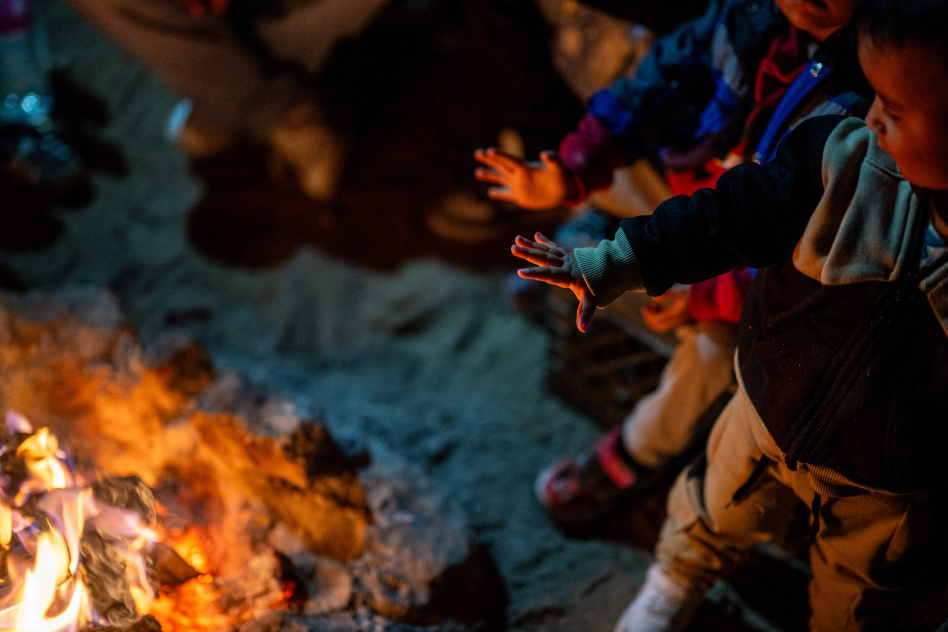 Một số người ngồi sưởi ấm quanh đống lửa gần bức tường ngăn chặn di dân bất hợp pháp, chờ bị các viên chức bảo vệ biên giới Mỹ bắt giữ đêm mùng 5 tháng Giêng 2025, khu vực thành phố Ruby, Arizona, Mỹ. (Ảnh: Brandon Bell/AFP/Getty Images)