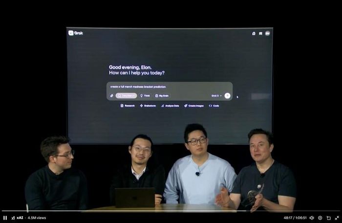Ông Elon Musk (ngoài cùng bên phải) cùng các thành viên trong xAI tại sự kiện ra mắt Grok-3 được phát trực tiếp trên mạng xã hội X. Ảnh chụp màn hình: Hà Anh/Mekong ASEAN.