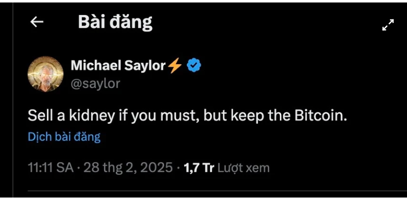 Trưa ngày 28/2 (giờ Hà Nội), lãnh đạo của một trong những công ty nắm nhiều Bitcoin đăng một dòng tweet gây hoang mang trên mạng xã hội X. “Cần thì hãy bán thận, nhưng phải giữ Bitcoin”, Michael Saylor viết. Nội dung nói trên nhanh chóng được lan truyền, với 1,6 triệu lượt xem chỉ sau 3 giờ xuất hiện.