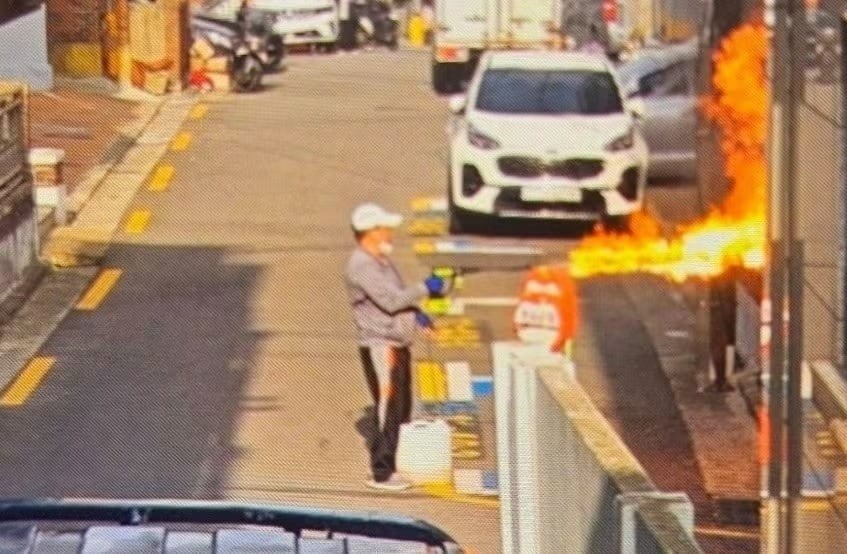 Hình ảnh được cho là người đàn ông dùng súng phun lửa tự chế, phóng hỏa tòa chung cư tại khu Bongcheon-dong, quận Gwanak, Seoul. (Ảnh: Chosun/Internet)