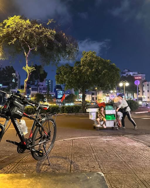 ... sau một vòng đạp xe quanh những con phố Sài Gòn, tôi dừng lại ở một góc nhỏ của thành phố. Giữa ánh đèn đường vàng dịu, giữa những tán cây thở khẽ dưới bầu trời xanh thẫm, tôi ngồi lặng lẽ. Một chiếc xe đạp dựng nghiêng bên lề. Một khoảnh khắc đời thường đang chầm chậm trôi qua trước mắt tôi: người mẹ tảo tần đẩy chiếc xe chất đầy những món đồ, trên đó, một em bé nhỏ ngồi hát vu vơ giữa phố đêm.