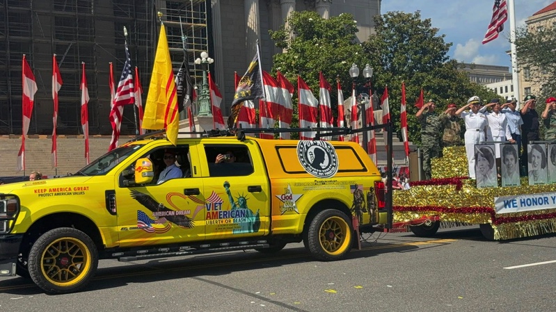 Khi phái đoàn , cầm biểu ngữ, toán quốc quân kỳ, xe hoa có những cô chú cựu chiến binh Việt Nam Cộng hòa , và hai nử quân nhân Mỹ gốc Việt , đứng lên chào và 1 xe hoa , 1 xe truck của Trường Giang , xe truck chở những lá cờ bay phất phới.