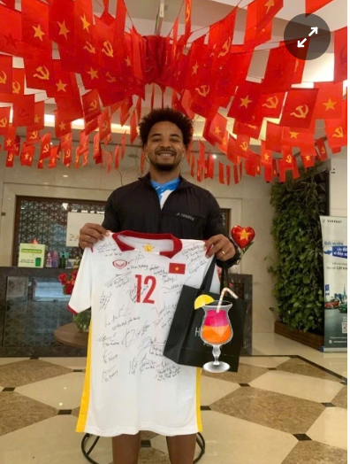 Việt Hương vừa chia sẻ hình ảnh tiền đạo Xuân Son cầm áo thi đấu do cô và nhiều nghệ sĩ Việt ký tặng như một món quà tinh thần.
