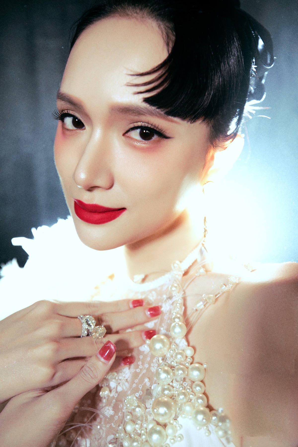 Hoa hậu Hương Giang trang điểm đậm tham gia show trong vai trò người mẫu trình diễn bộ sưu tập của nhà thiết kế Cao Minh Tiến.