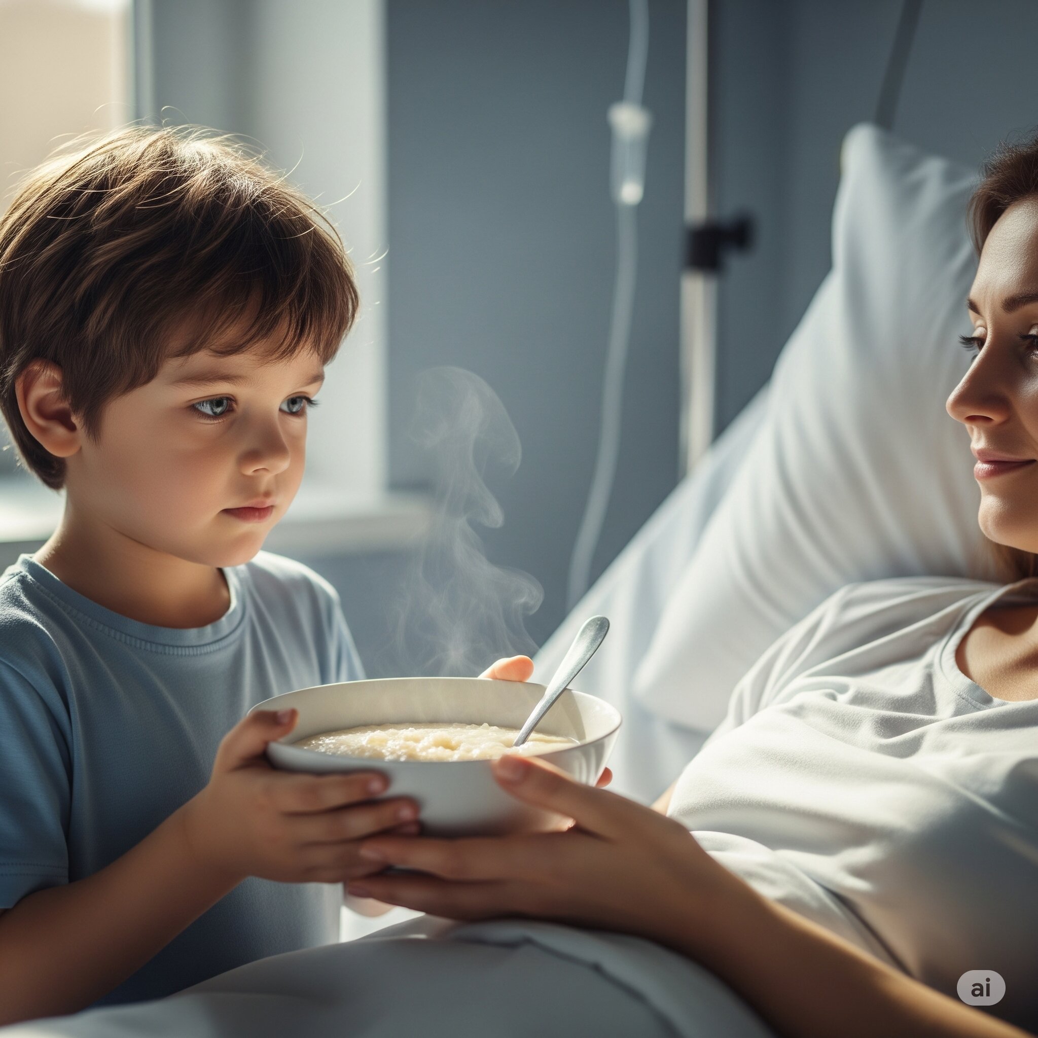 Tôi nh́n tô cháo mẹ ăn, ḷng chùng xuống. Vị nhạt thếch, chẳng có chút mùi thơm, vậy mà mẹ vẫn cố nuốt từng muỗng, mắt không rời đứa cháu nhỏ đang chơi bên cạnh.