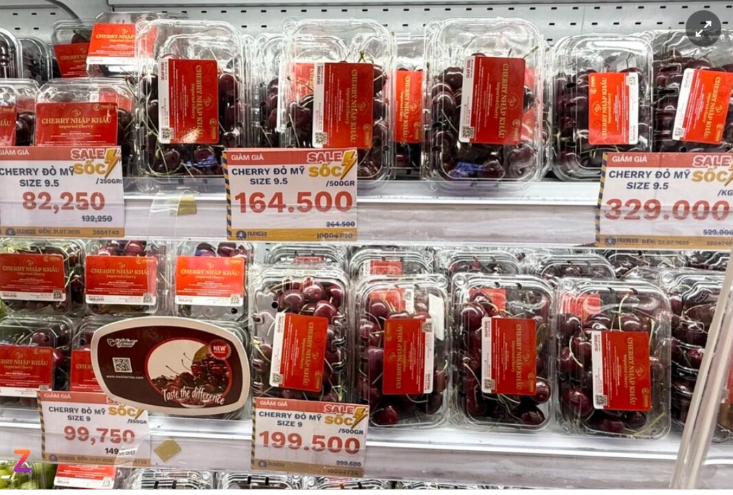 Cụ thể, cherry đỏ Mỹ size 9,5 giảm từ 599.000 đồng/kg xuống còn 329.000 đồng/kg, trong khi size 9 giảm 43% còn 399.000 đồng/kg.