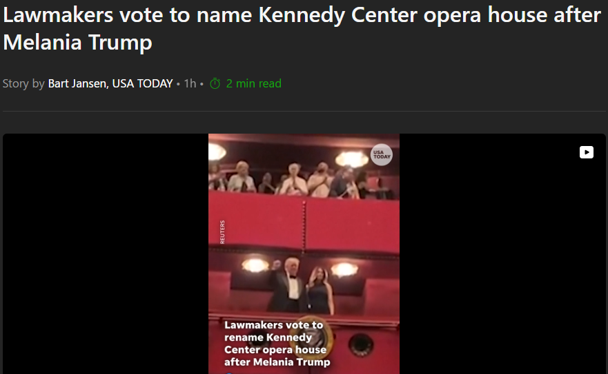 Tuy nhiên, động thái này phản ánh sự ủng hộ từ Đảng Cộng hòa, những người kiểm soát cả hai viện của Quốc hội. Nhà hát sẽ được đặt tên là "Nhà hát Opera Đệ nhất Phu nhân Melania Trump" nếu dự luật được thông qua.
